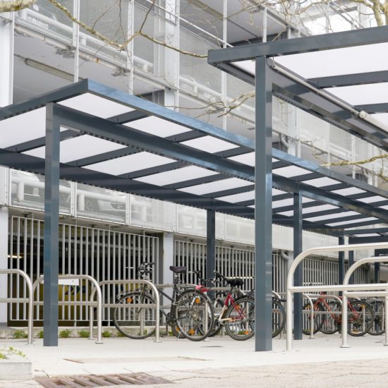 Fahrradunterstände aus Aluminium als Anbauvariante oder freistehend.