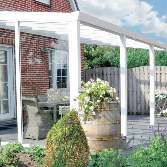 Terrassenüberdachungen aus Kiefernholz, Leimholz oder Aluminium mit einem Dach in PVC, Polycarbonat oder Echtglas.