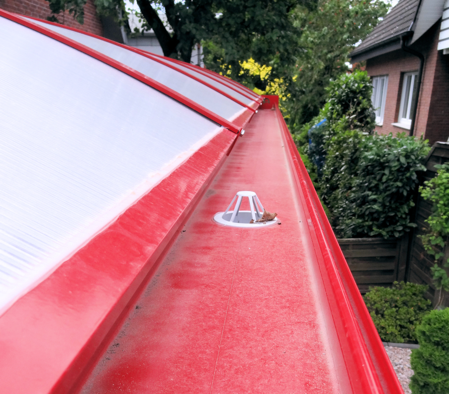Die Rinne ist teil der Konstruktion und verläuft links und rechts auf den Pfosten. Ein Dachgulli mit Fallrohr ist inklusive und verläuft beim Einzelcarport sogar versteckt im Pfosten.