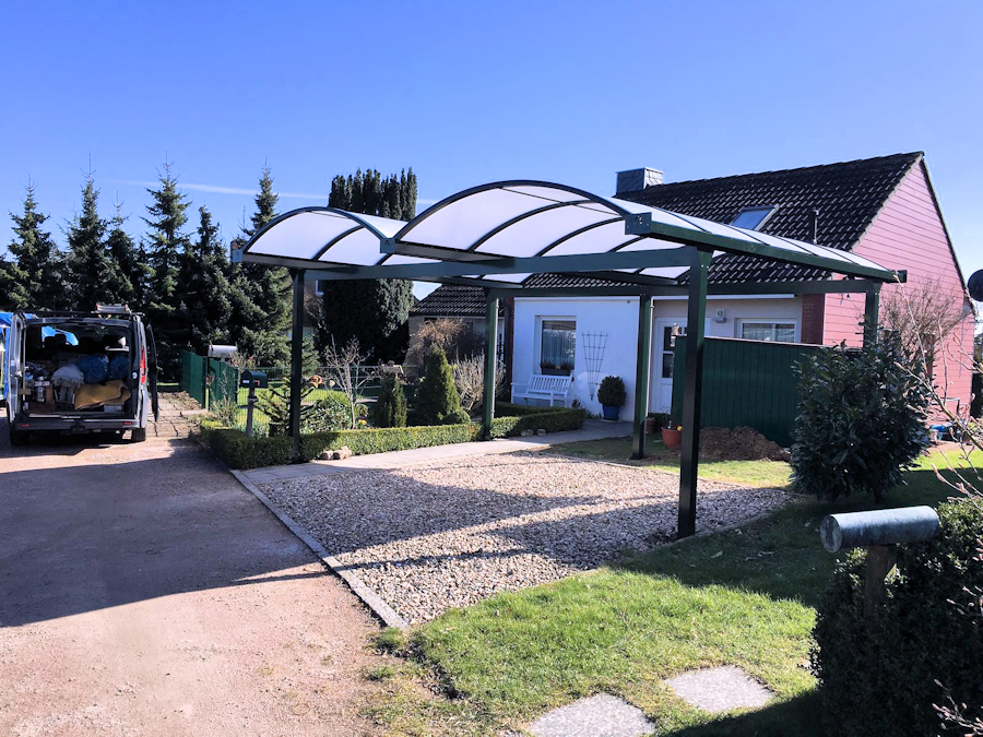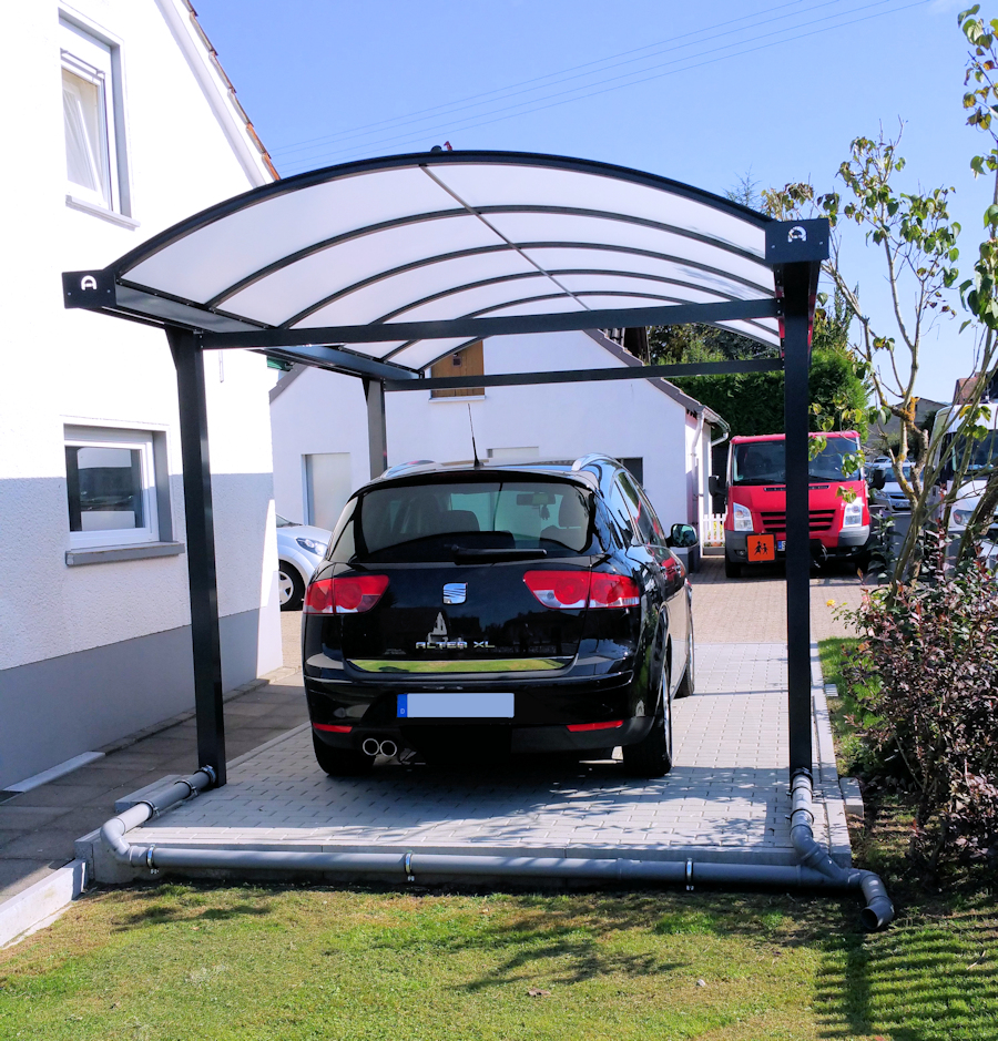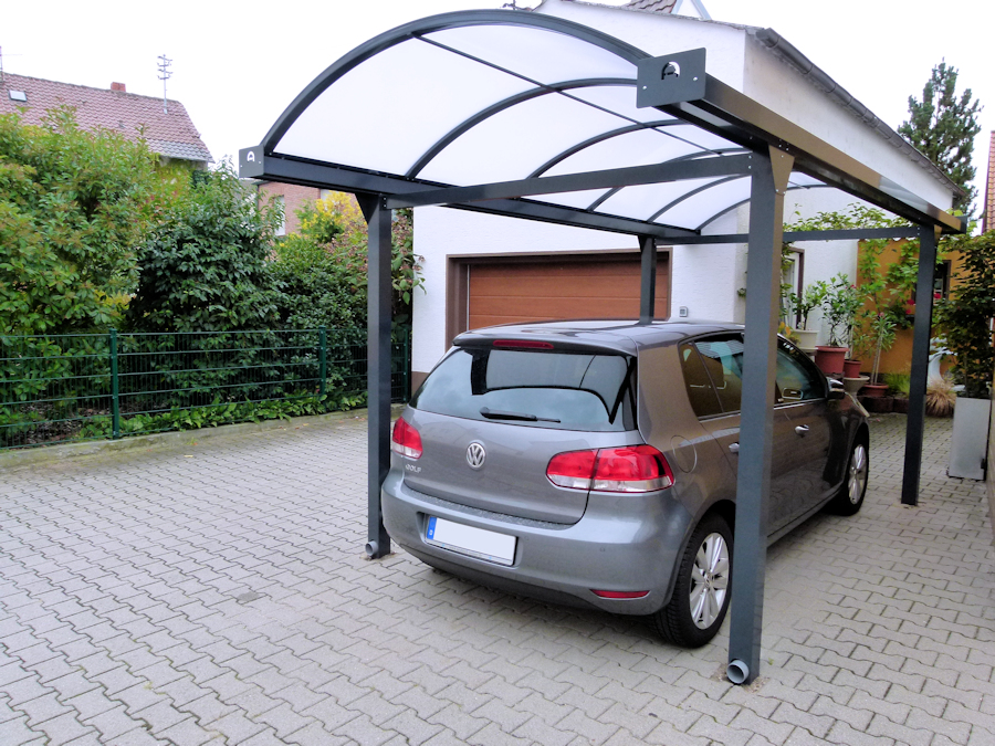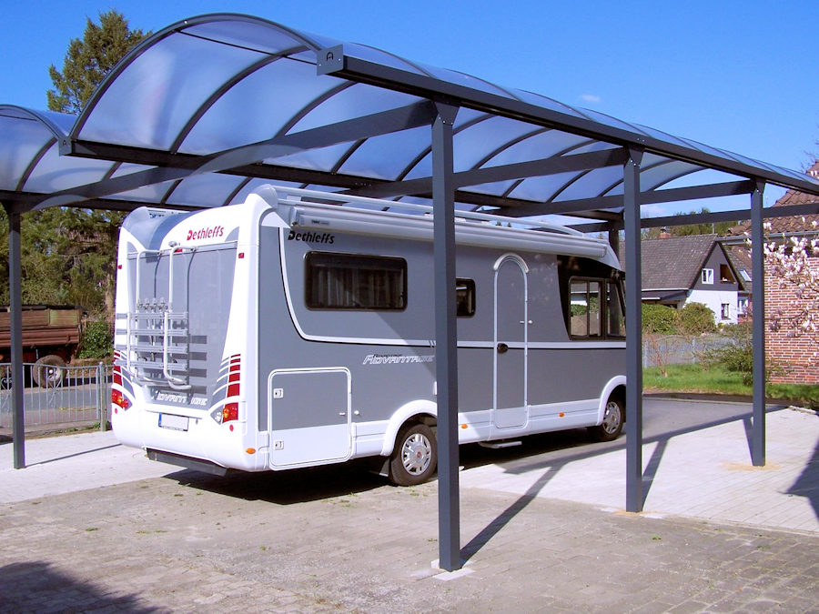 Unsere Bogendachcarports Typ N aus Aluminium werden in unserem Auftrag in Europa produziert. Die Carports sind so konstruiert, dass sie mit möglichst wenig Pfosten auskommen.