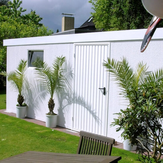 Die DUROBOX® Superior hat eine glatte und verputzte Außenwand. Sie ist von außen von einer gemauerten Garage kaum zu unterscheiden. Sie können an der Innenwand ohne Weiteres etwas anschrauben und befestigen. Alternativ kann man den hinteren Bereich auch als Abstellraum nutzen.